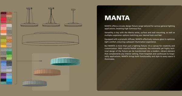 Veelzijdigheid staat centraal bij de MANTA-serie: het armatuur is geschikt voor opbouw- en wandmontage en biedt daarnaast meerdere ophangopties die passen bij de gewenste uitstraling en sfeer. Maar MANTA is meer dan alleen een verlichtingsarmatuur – het is een canvas voor creativiteit en maatwerk. Met kleurrijke PETFelt-accessoires kan het minimalistische maar technisch geavanceerde ontwerp worden omgetoverd tot een modern en levendig element dat naadloos aansluit bij elk interieur. Of het nu gaat om ziekenhuizen, zorginstellingen of horecatoepassingen – MANTA brengt zowel functionaliteit als stijl in elke ruimte die het verlicht.