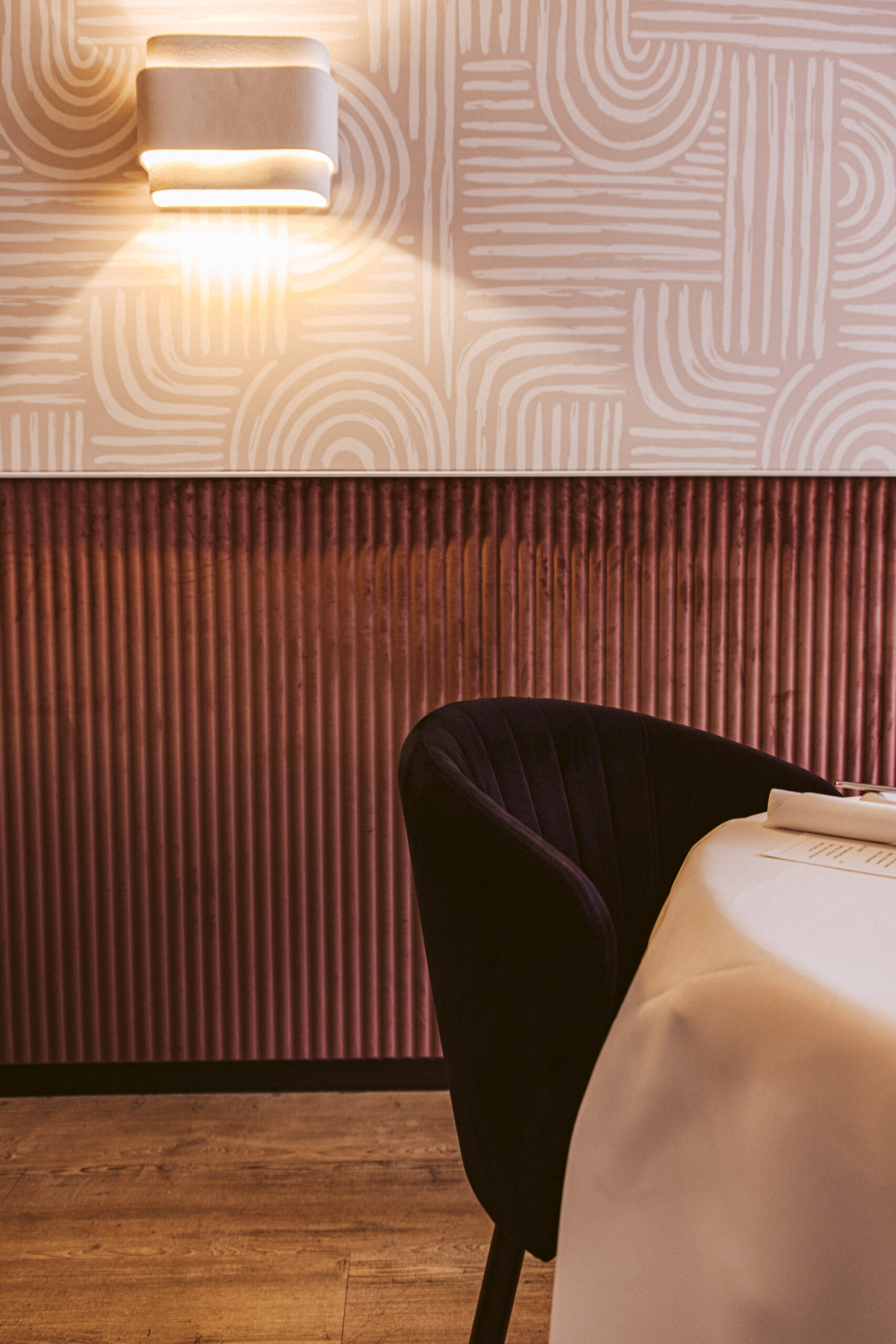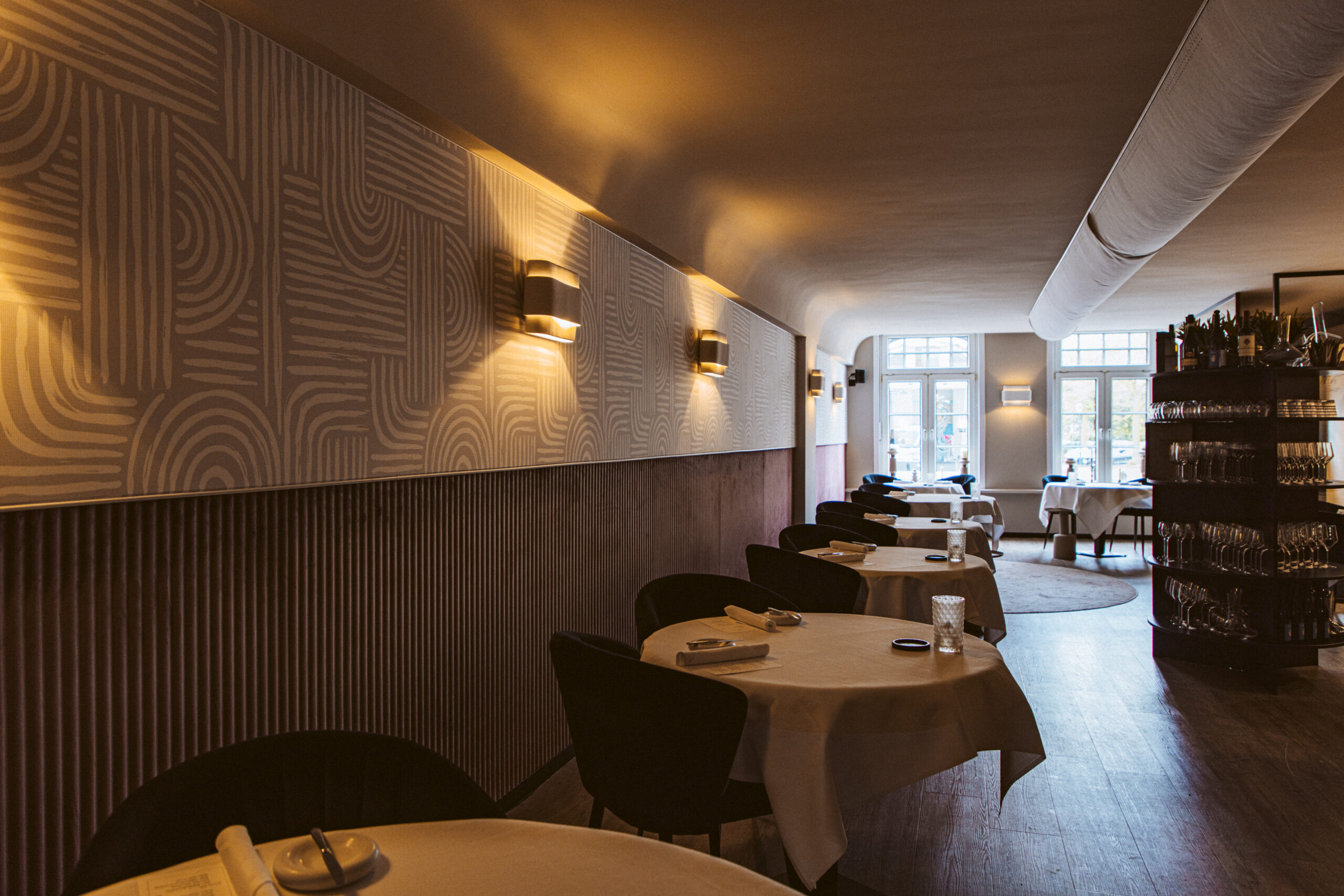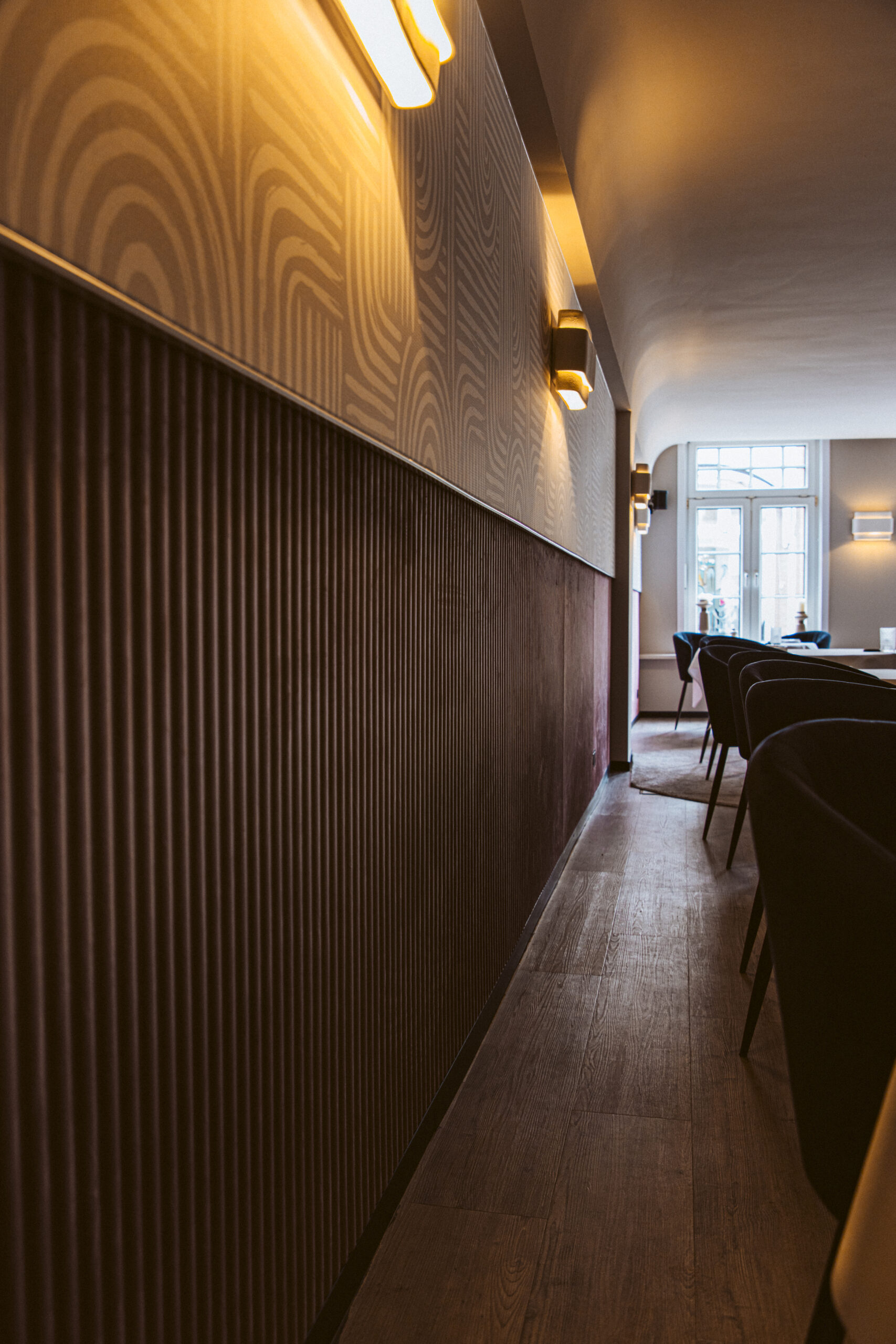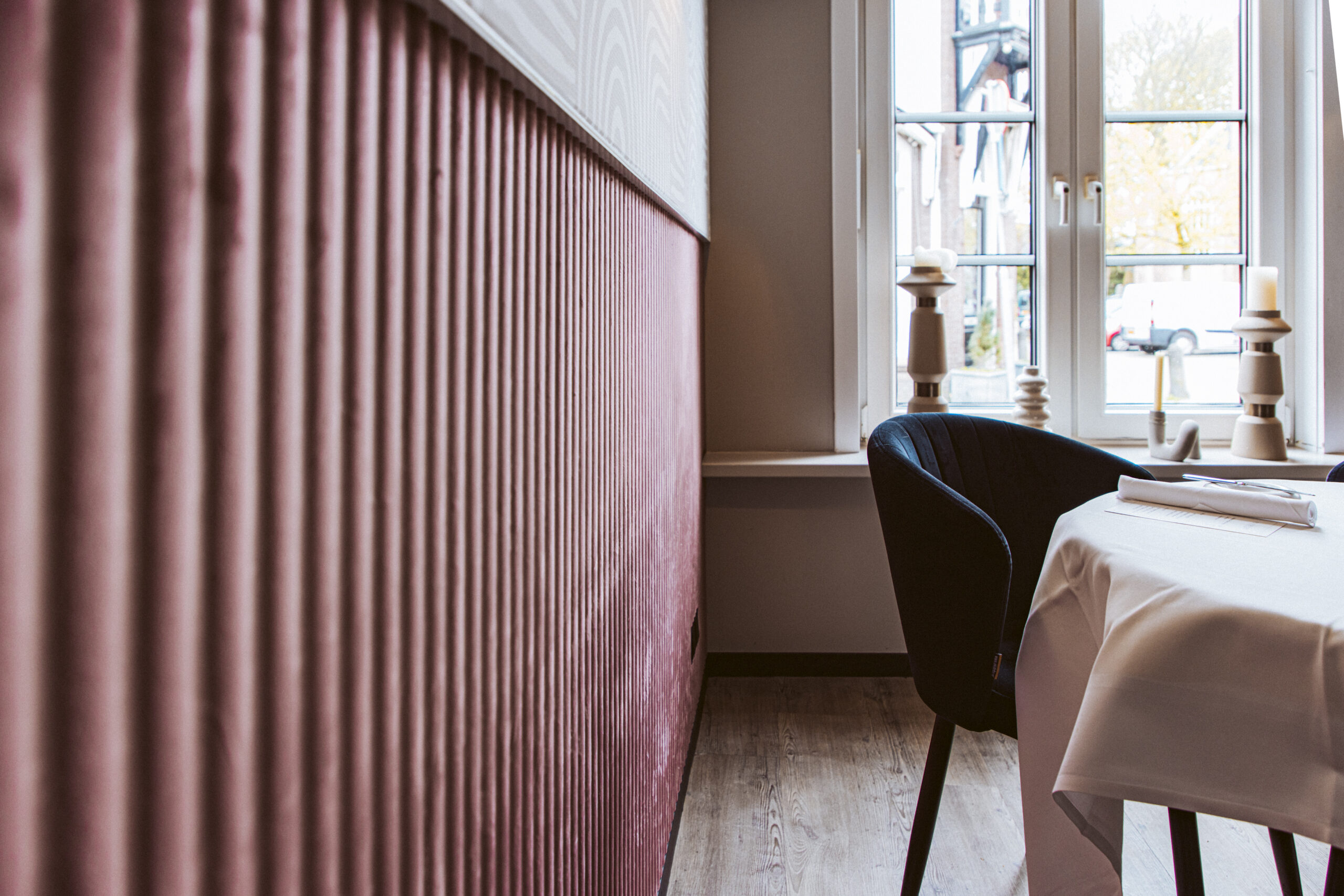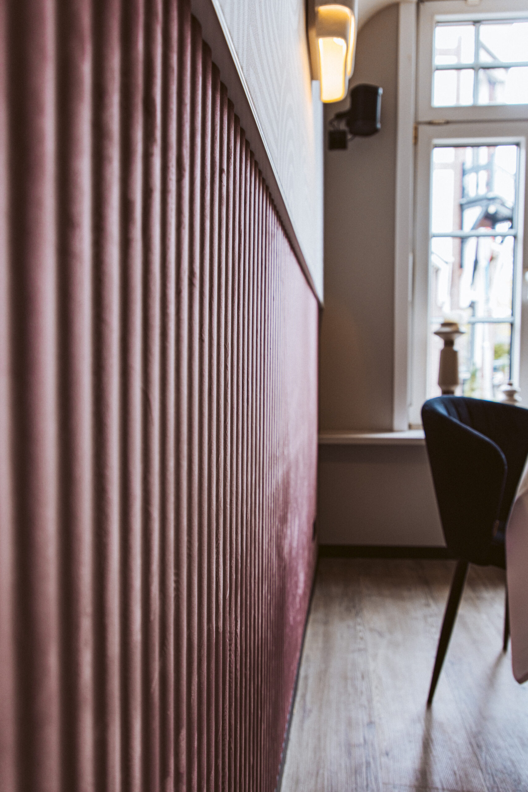 In samenwerking met HUUS design hebben we voor een aangename akoestiek mogen zorgen door het toepassen van een prachtige velvet lambrisering van Slalom, met daarboven een volledig op maat gemaakte akoestische textielwand.