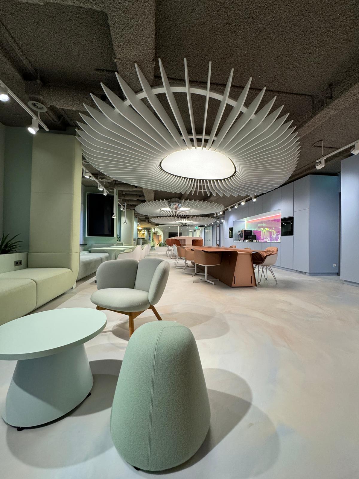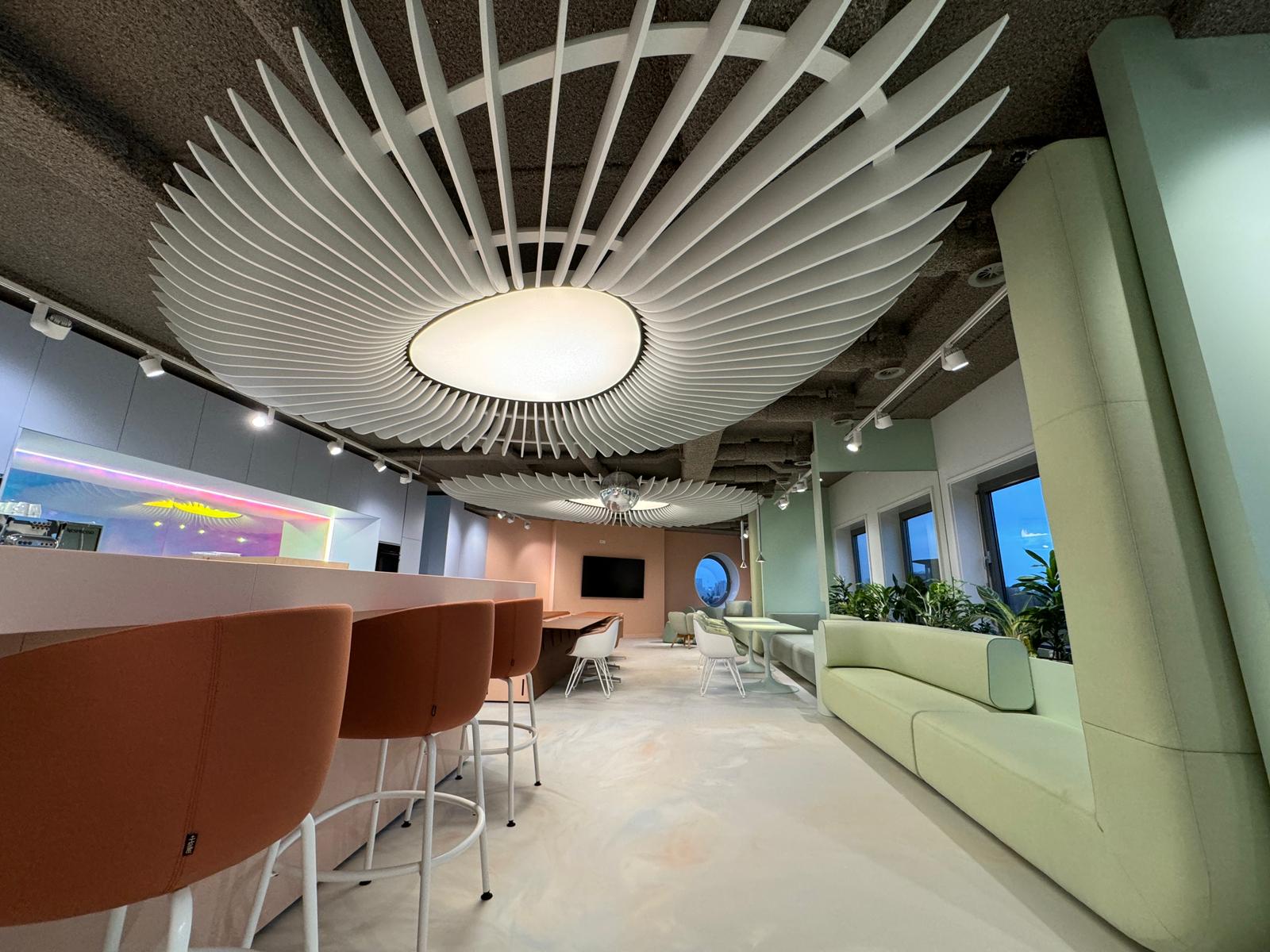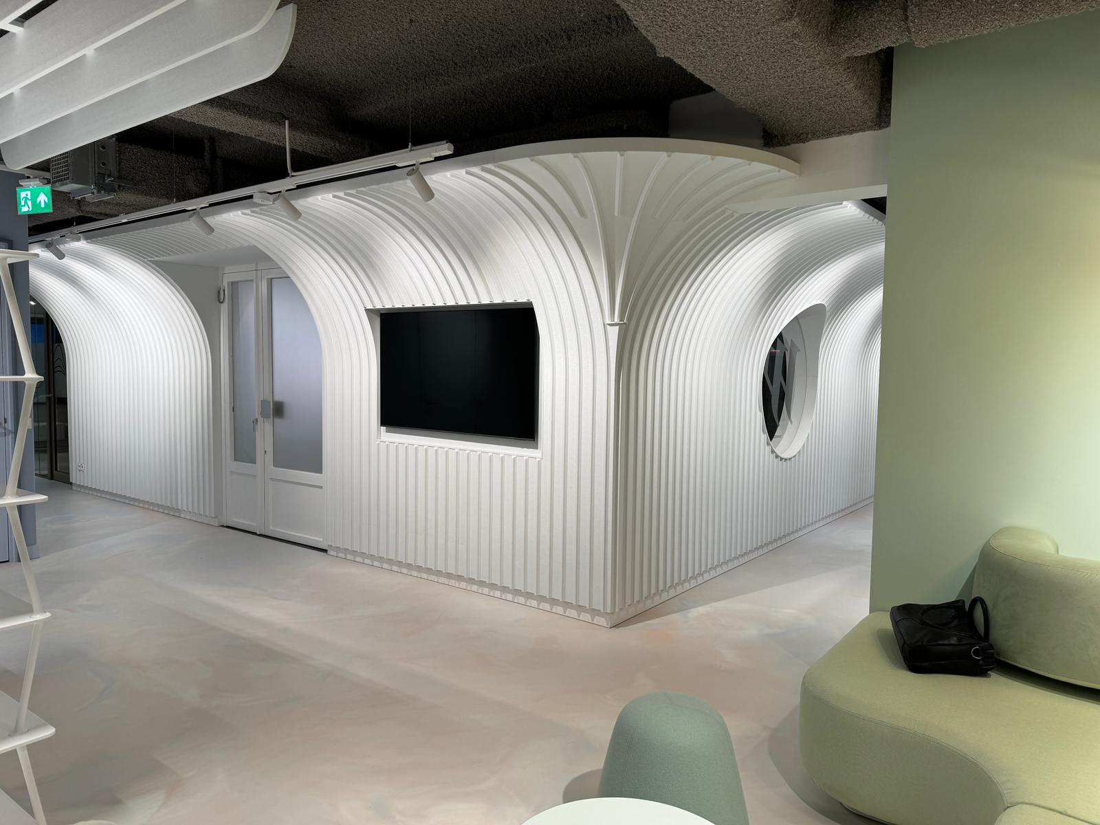 In samenwerking met Casper Schwarz en AMB en in opdracht van Make Interiors BV maakten we voor Unibail-Rodamco-Westfield deze custom-fit akoestische elementen vanaf scratch. Een stukje haarfijne engineering, een stel ”knappe koppen” en Zünd Benelux BV maken een uiterst goede combi zoals jullie kunnen zien. Én natuurlijk absoluut de complimenten voor ons monteursgilde dat ook met deze klus weer heeft gezorgd voor een fantastisch eindresultaat. Van gewaaierde PETFelt lamp (binnenkort verkrijgbaar⌛) met geïntegreerde translucente Barrisol Normalu SAS en akoestische baffles tot een unieke, organische gevormde PETFelt kernwand
